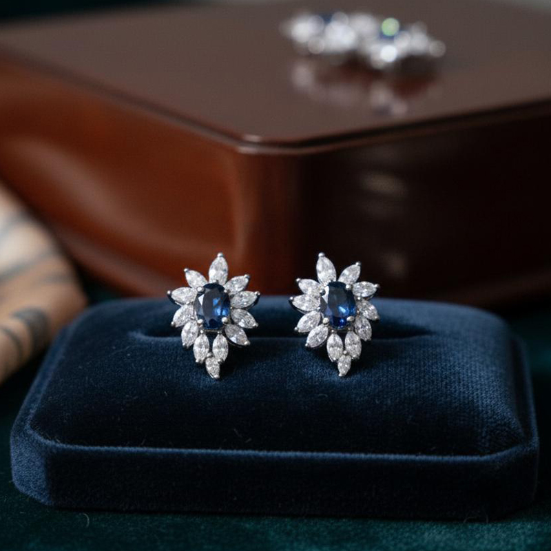 These pear-shaped earrings showcase a captivating sapphire at the center, surrounded by high-quality sparkling stones. Their elegant design blends classic beauty with modern sophistication, making them a perfect choice for any occasion.