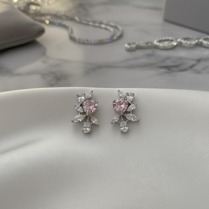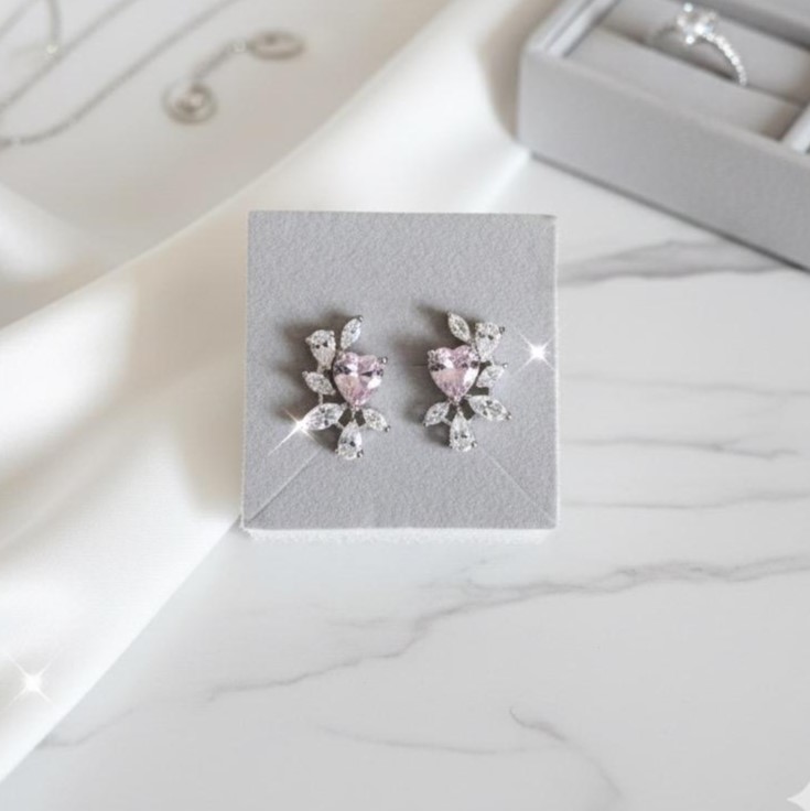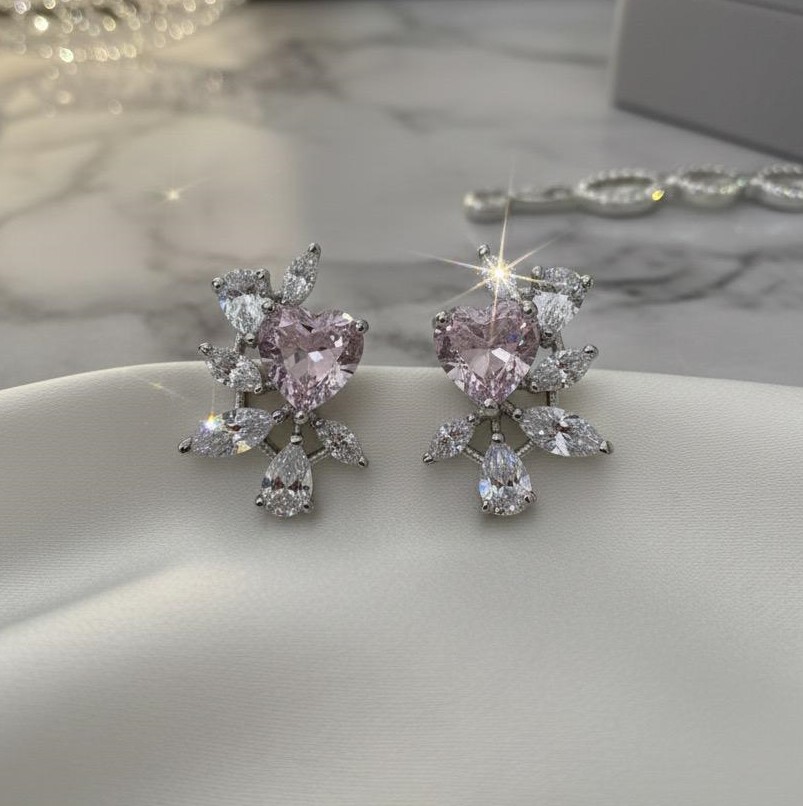 A heart-shaped pink stone surrounded by several smaller cubic zircons perfect for any occasion
