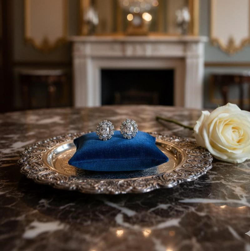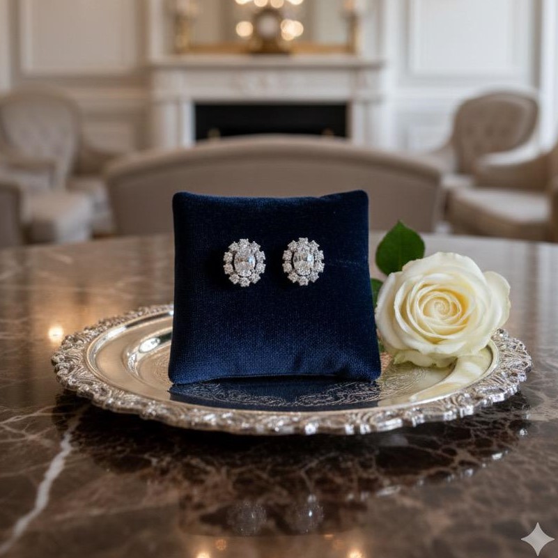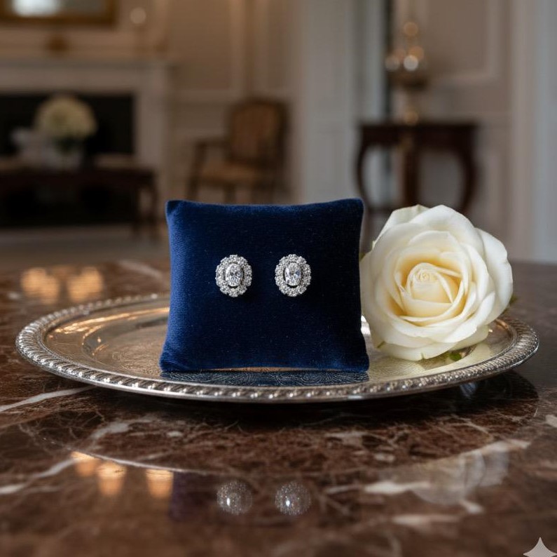 Oval studs surrounded by a halo of stones giving you a premium exquisite look