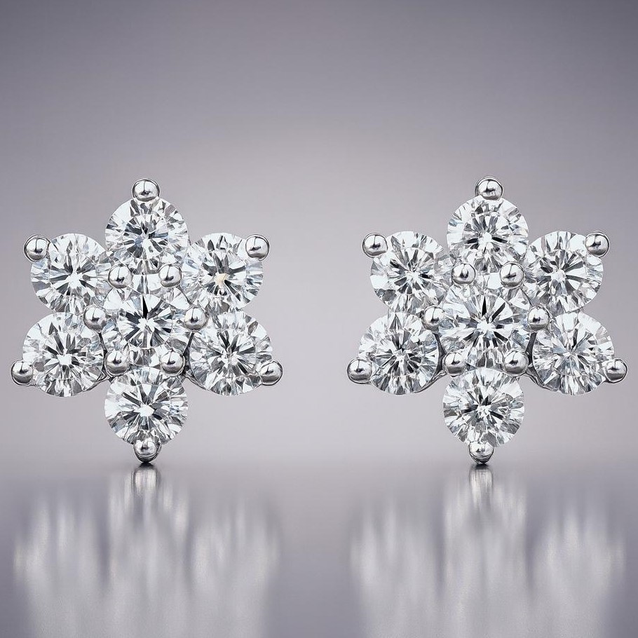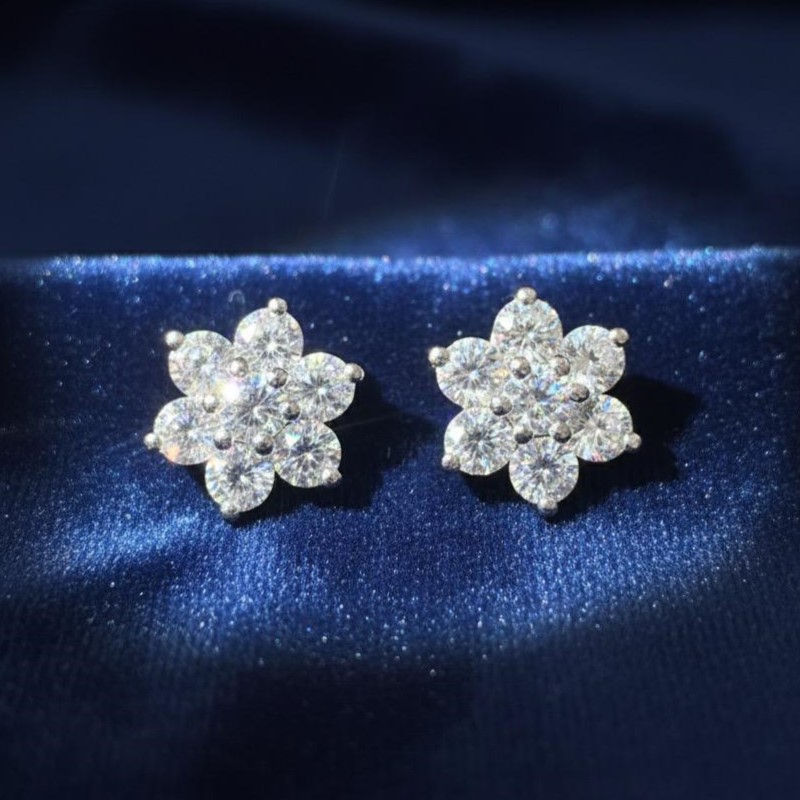 The earrings feature a cluster design, with seven brilliant-cut jewels set together to form a delicate flower. The stones are high-quality cubic zirconia, catching the light with intense sparkle.