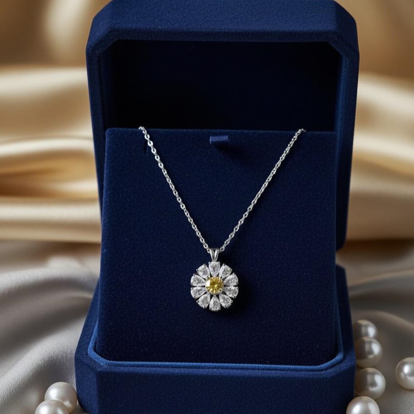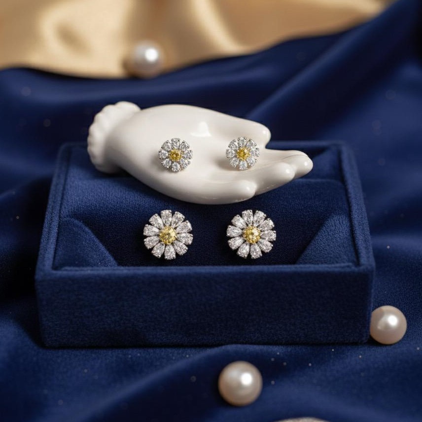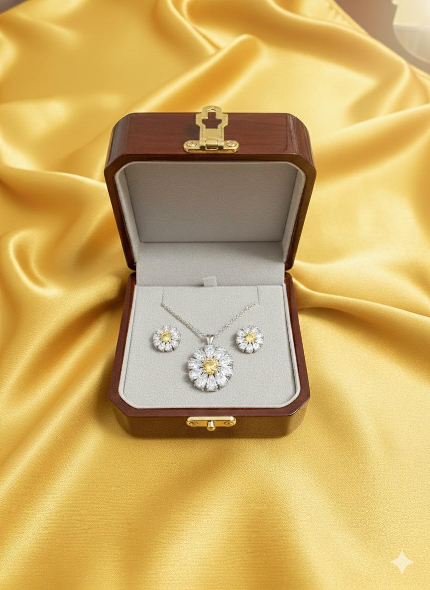 Presenting a stunning, coordinated jewelry set featuring a pendant necklace and matching stud earrings. Each piece captures the intricate beauty of a daisy, designed for timeless elegance.