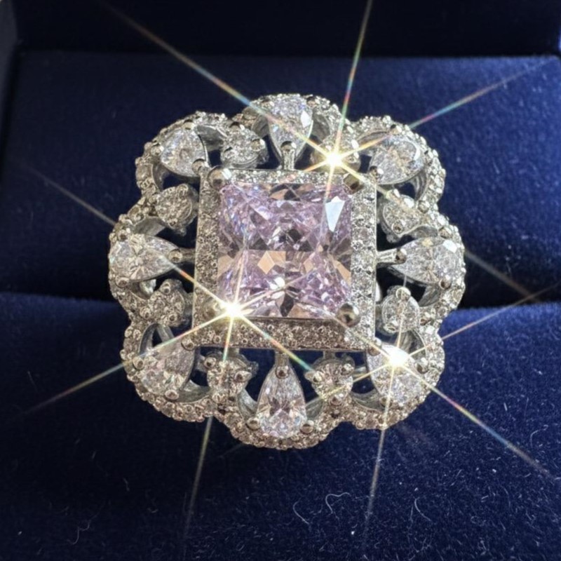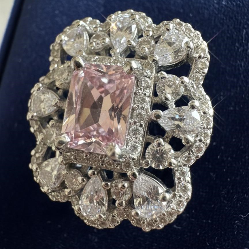A large, square-cut pink gemstone at the center, surrounded by numerous smaller, clear rhinestones or diamonds arranged in a floral or clustered halo design. Perfect for any occasion