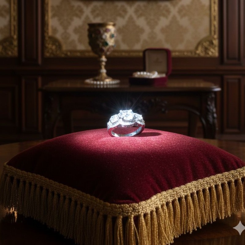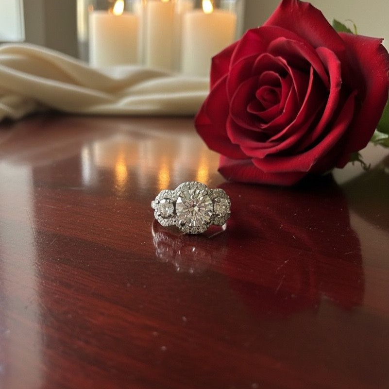 A three-stone style or a cluster ring with a prominent round brilliant-cut center stone