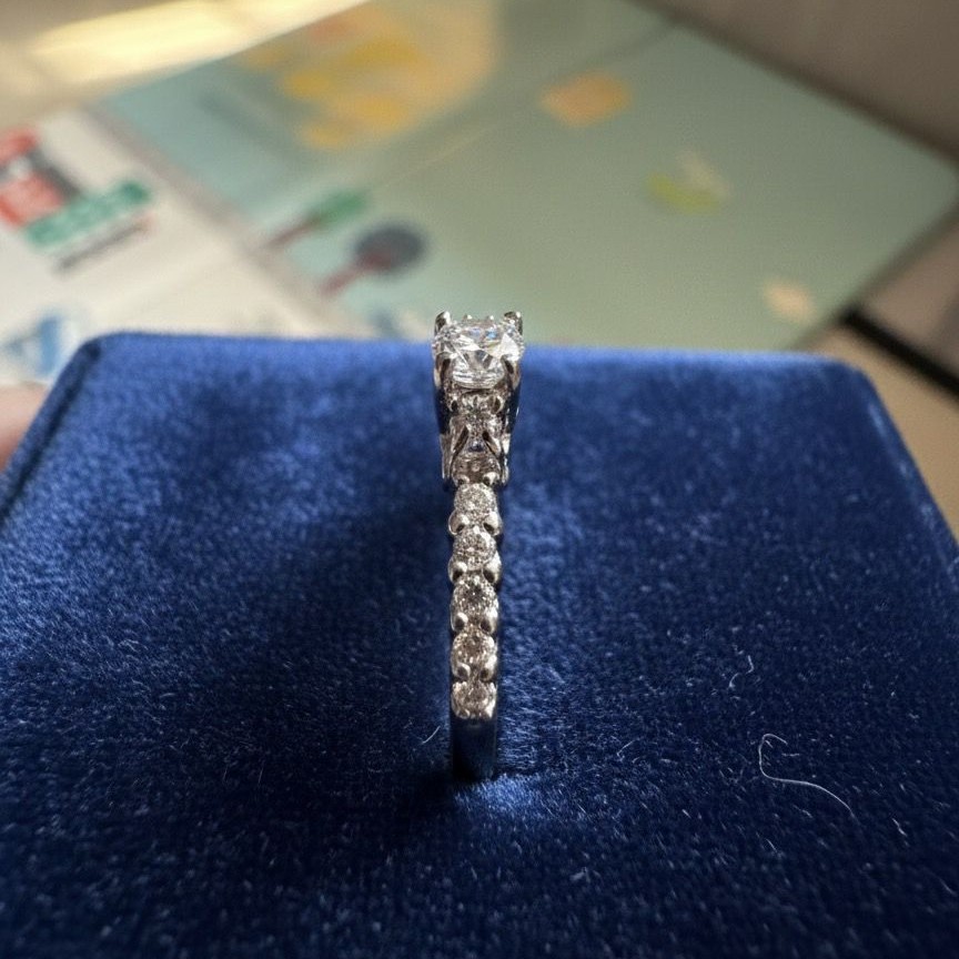 A center round cut stone with a band adorned with smaller diamonds, making it a pavé or channel-set style