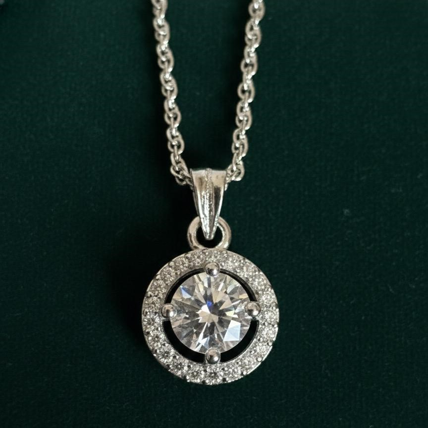 A brilliant-cut center stone cubic zirconia set in a silver halo of smaller surrounding stones. The pendant catches the light, showing off its facets.